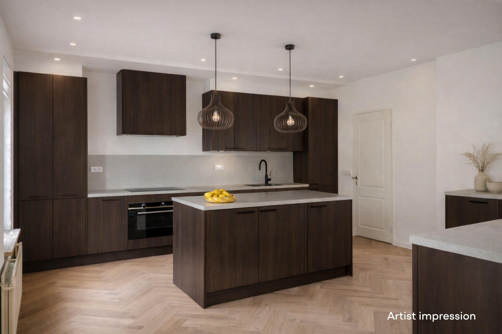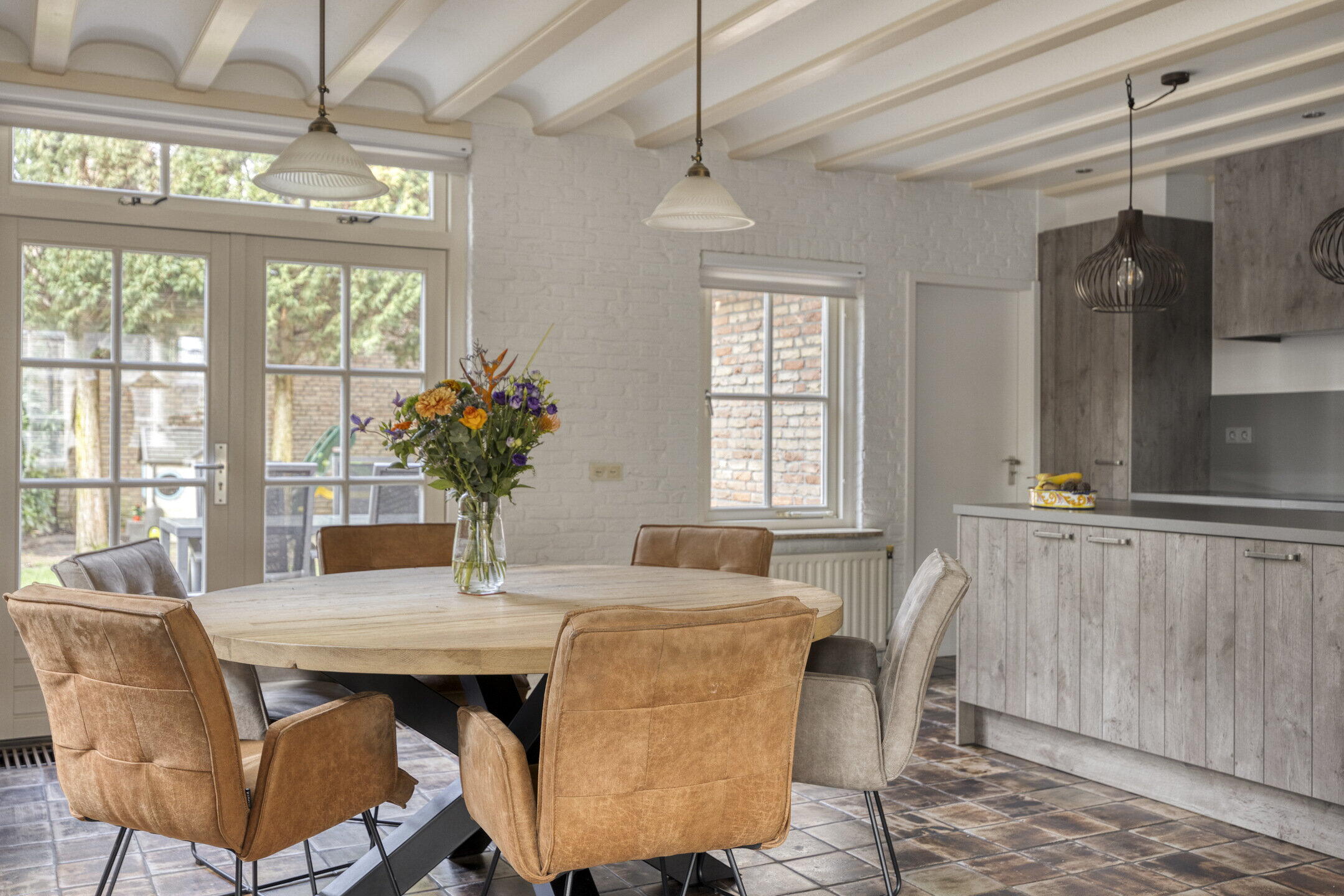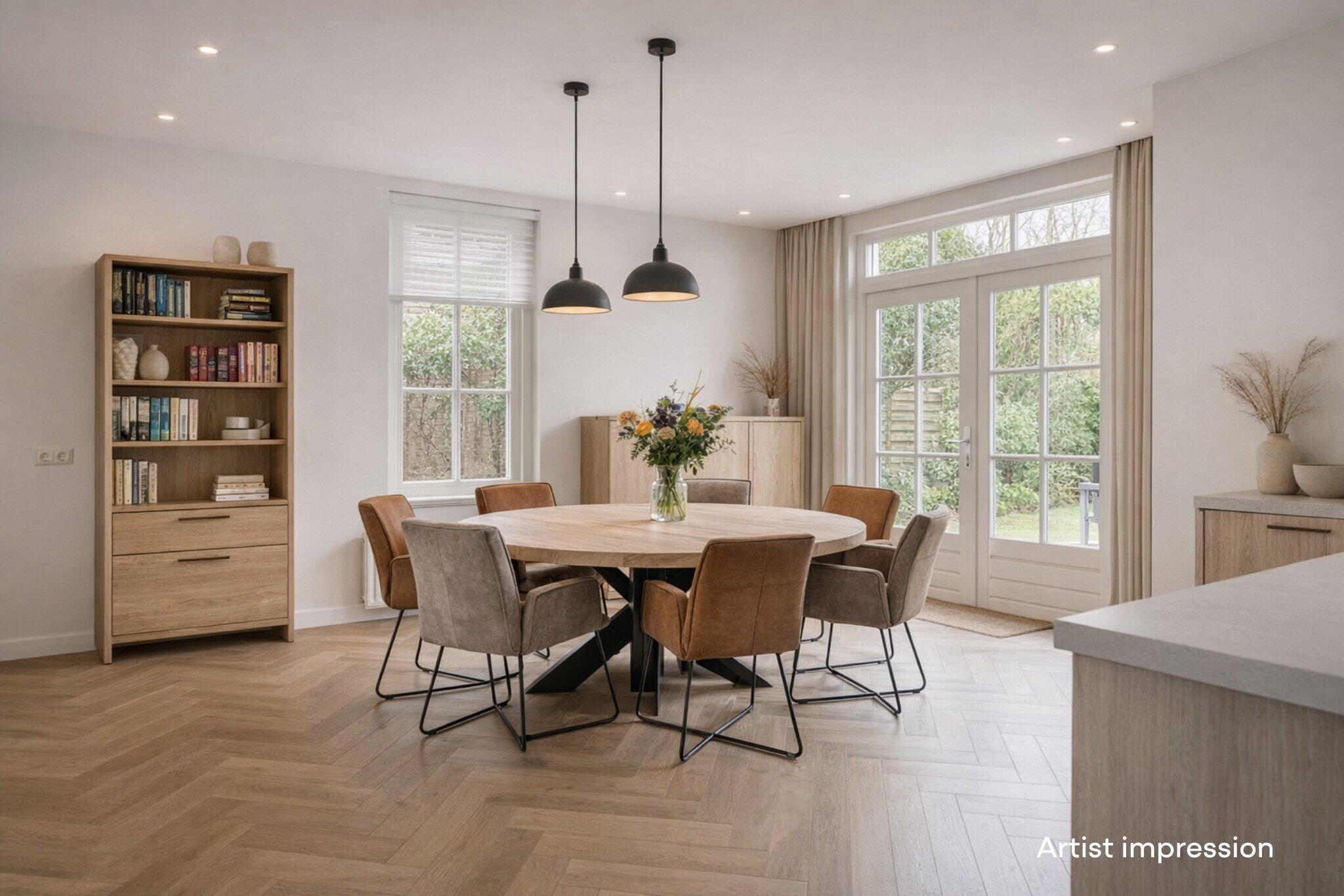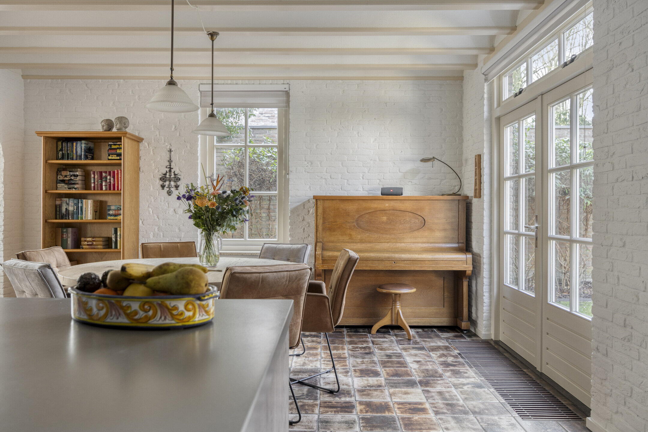 Via de doorgang bereik je de royale leefkeuken. Ook hier stroomt het daglicht rijkelijk naar binnen. De openslaande deuren naar de tuin maken dit een heerlijke plek, zie je jezelf al ’s ochtends met een kop koffie zo de tuin in lopen?