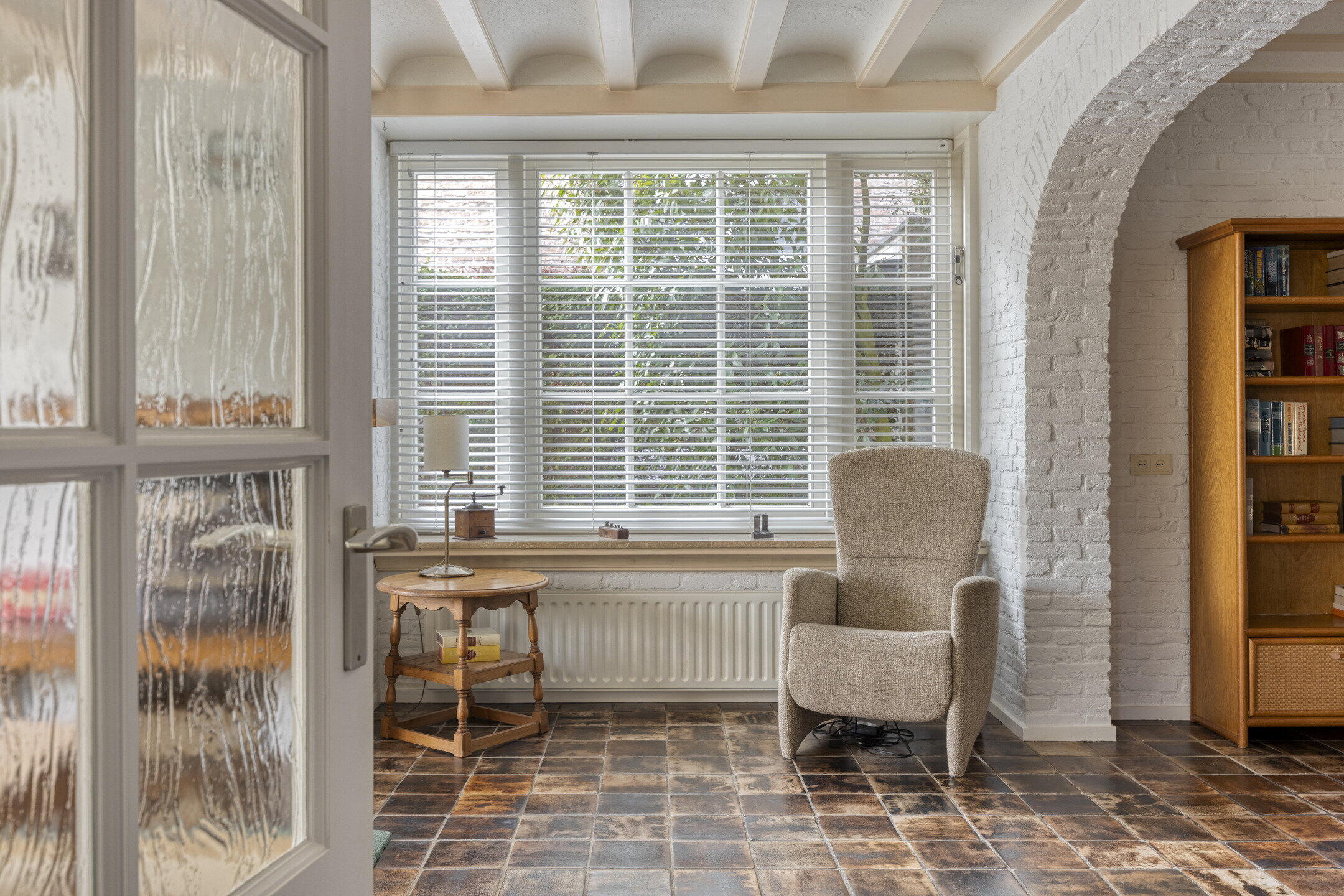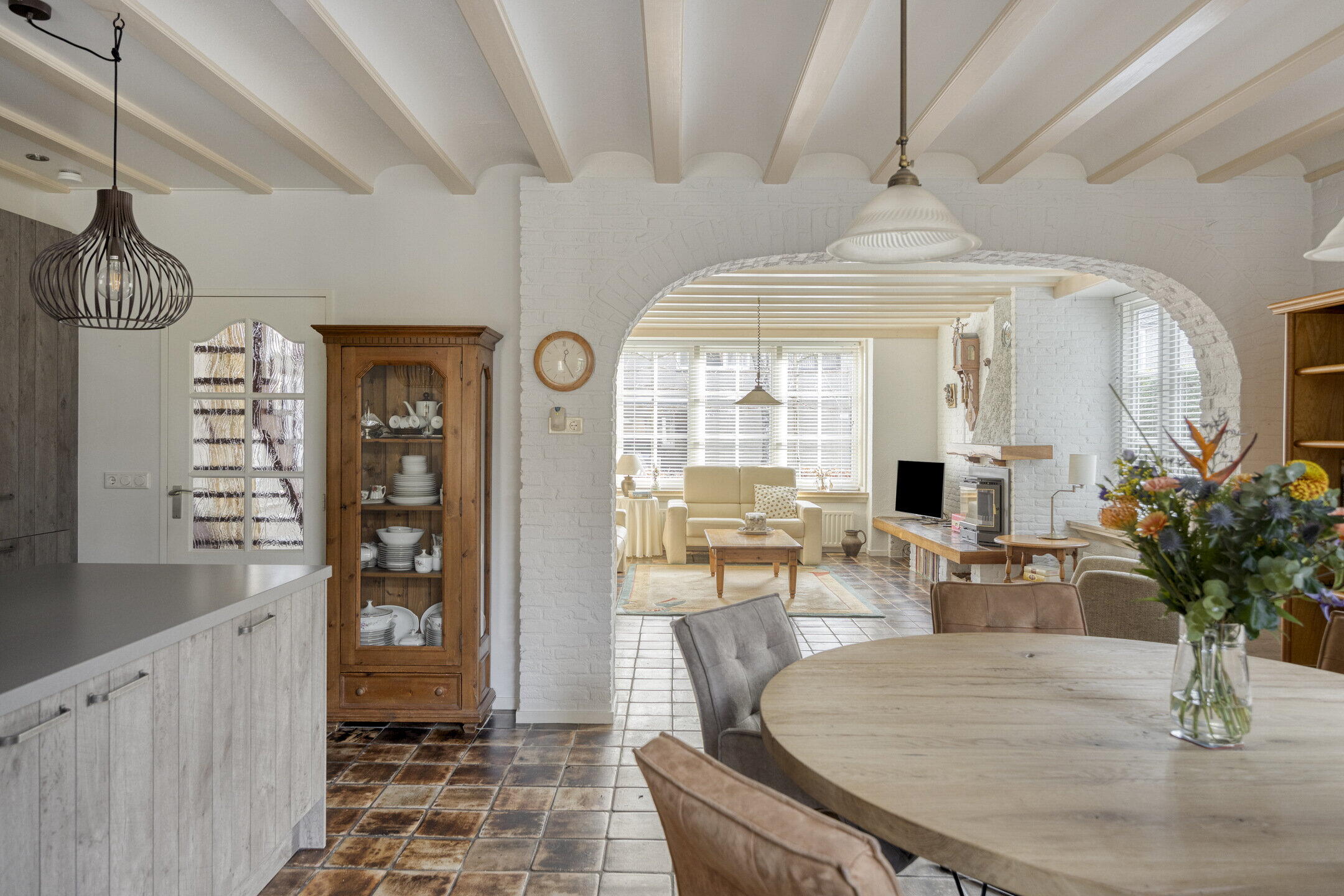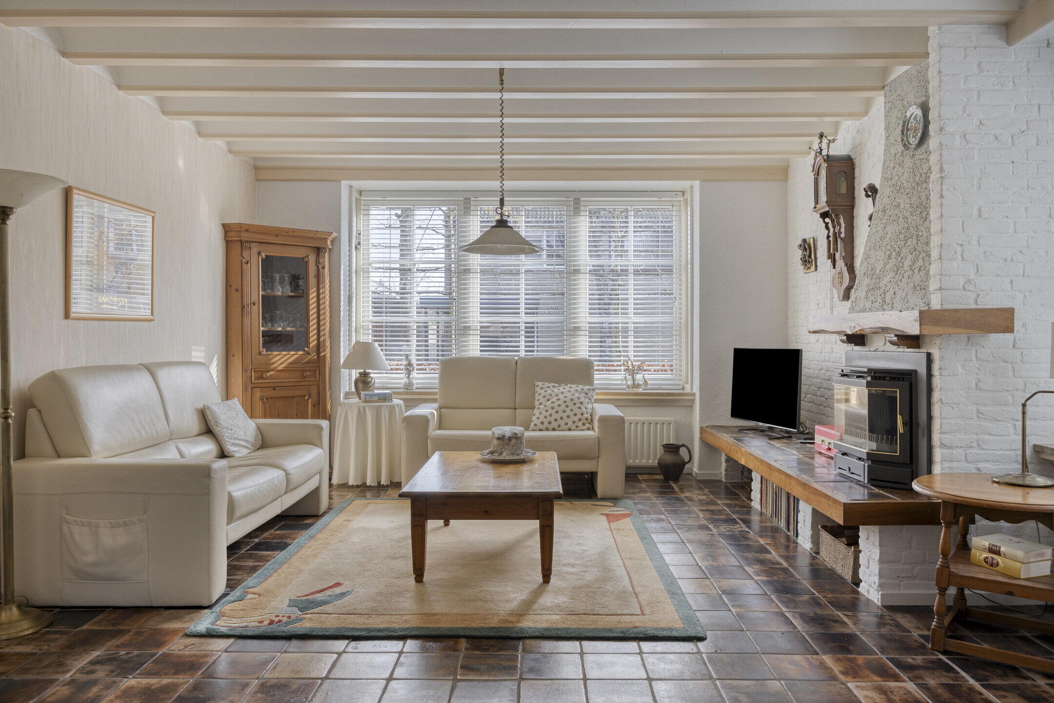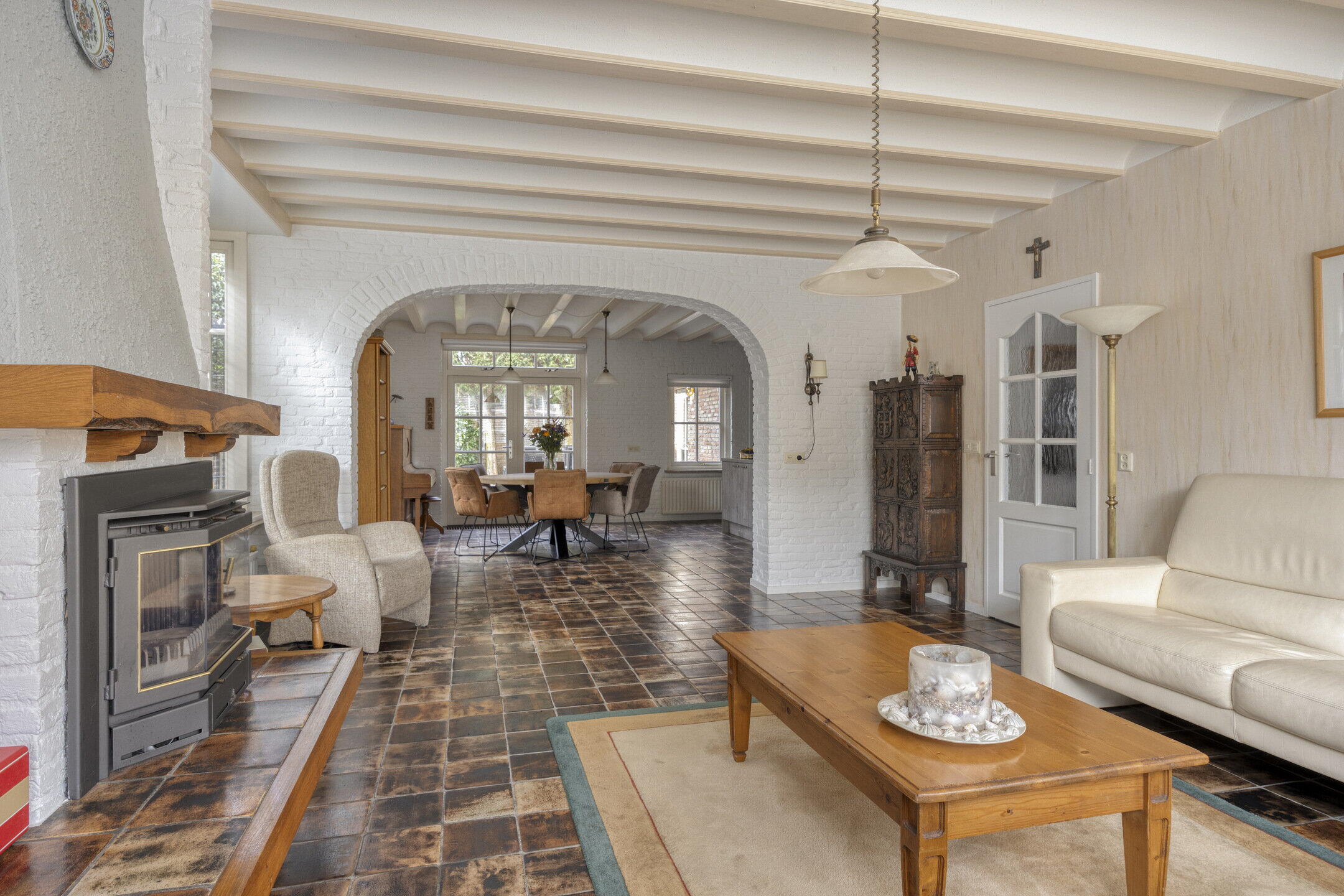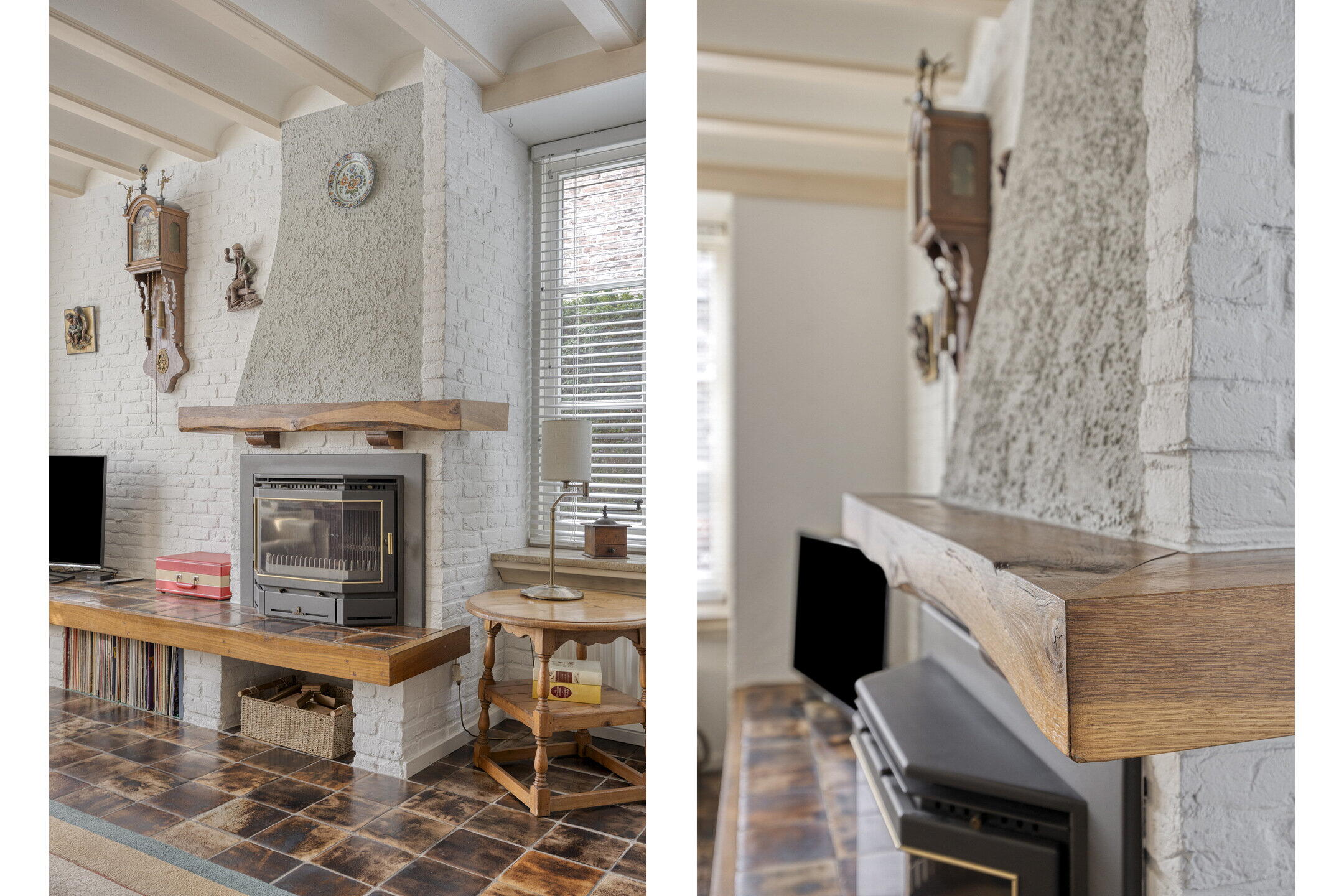 Je stapt de woonkamer binnen en wordt direct verrast door de enorme hoeveelheid licht. De prachtige raampartijen met kleine ruitjes zorgen voor een warme, sfeervolle uitstraling. Het traditionele balkenplafond versterkt het karakter van de ruimte en de centraal geplaatste open haard vormt letterlijk en figuurlijk het hart van de woonkamer.