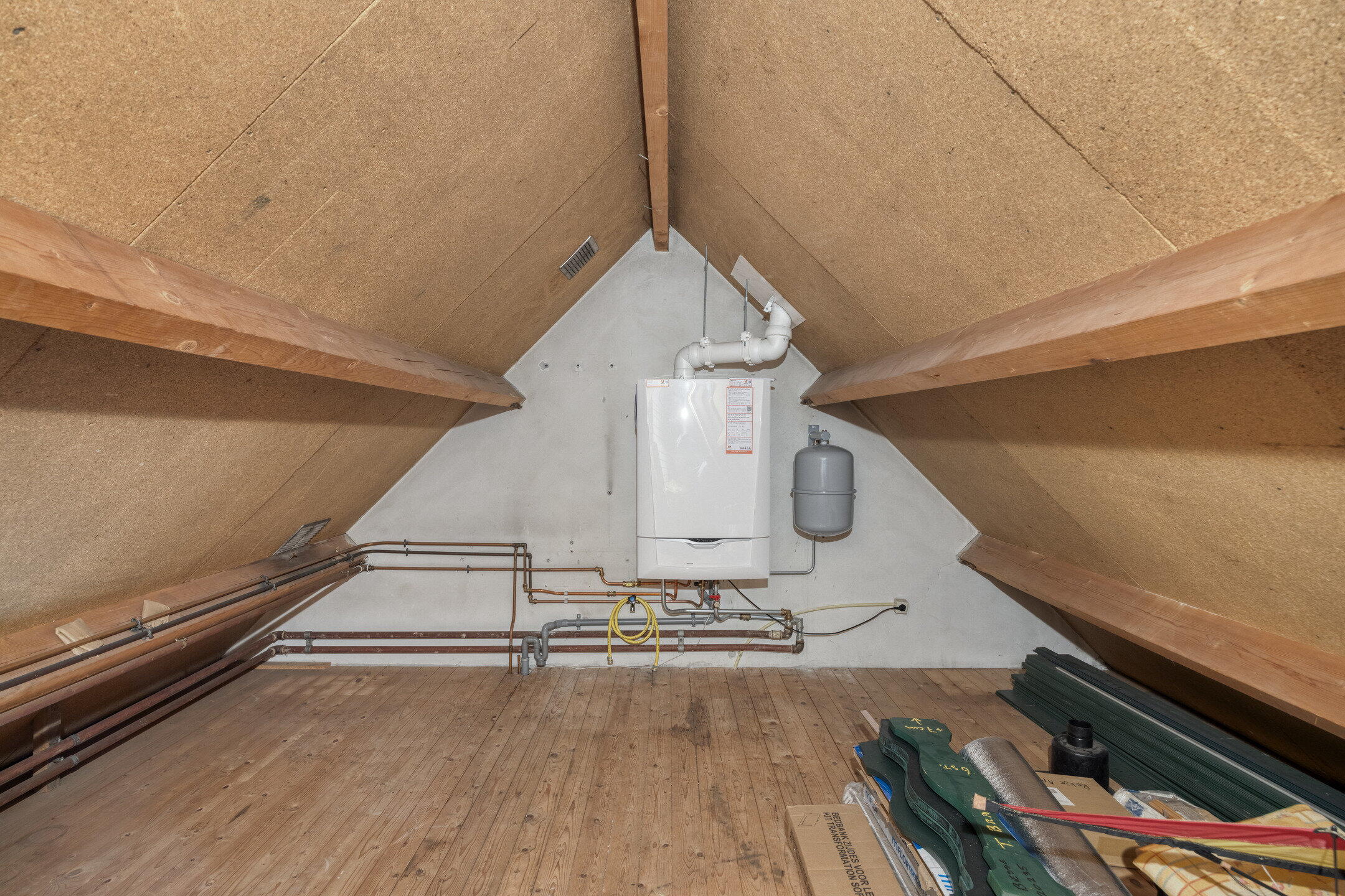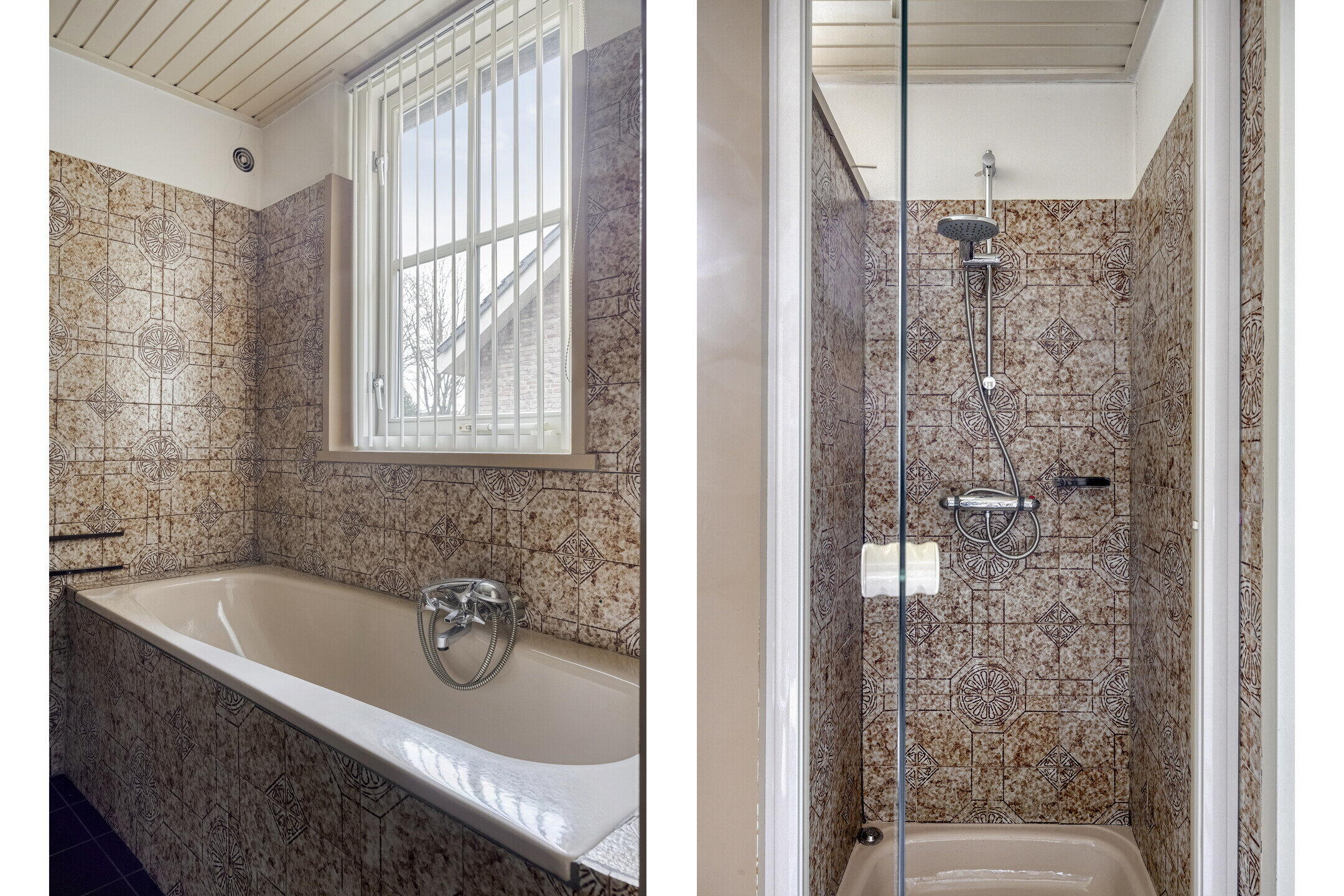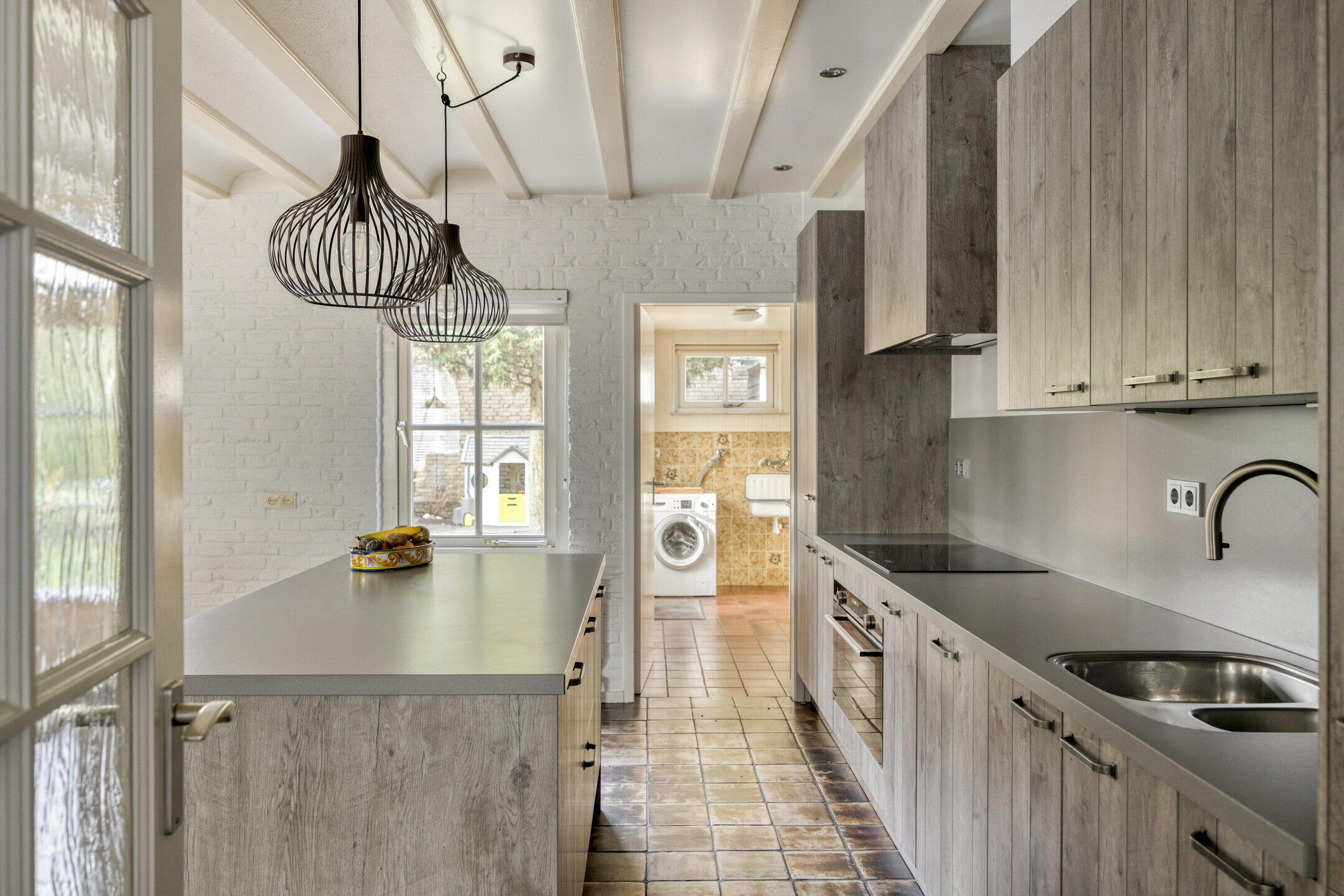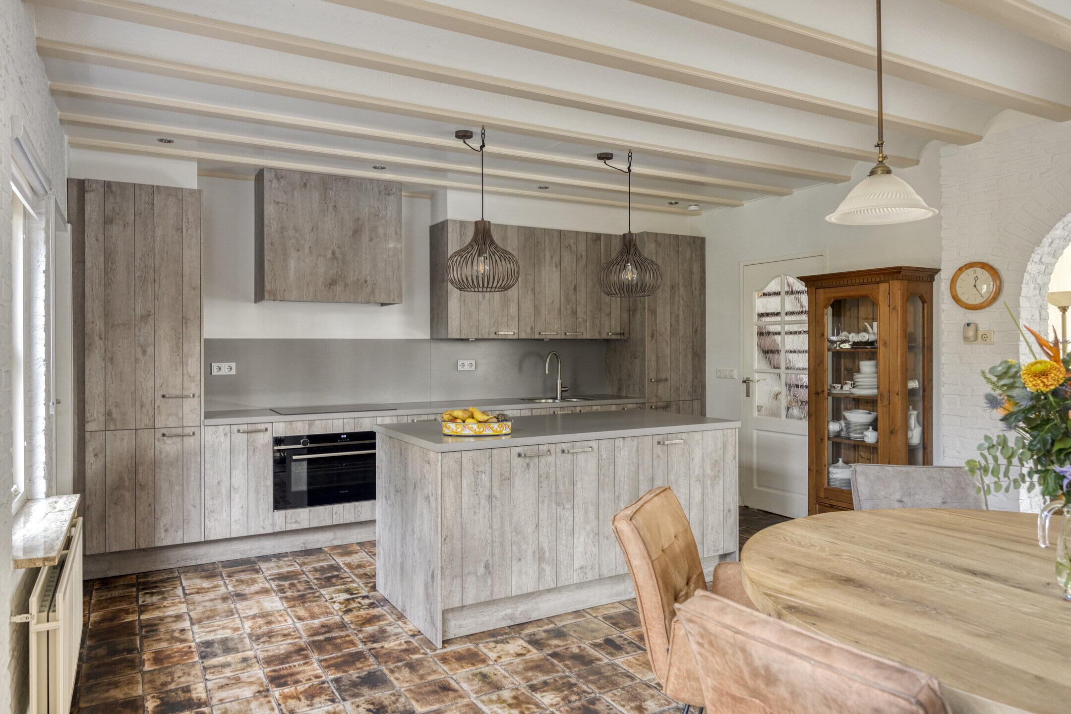 De keuken is ruim opgezet met een kookeiland en biedt volop plek voor een grote eethoek en extra kastruimte. Aansluitend vind je de praktische bijkeuken met witgoedaansluitingen, een deur naar de tuin én toegang tot de garage. Ideaal voor extra koel- of vriesruimte. Daarnaast is hier via een vlizotrap de vliering boven de schuur bereikbaar, waar ook de cv-opstelling zich bevindt.