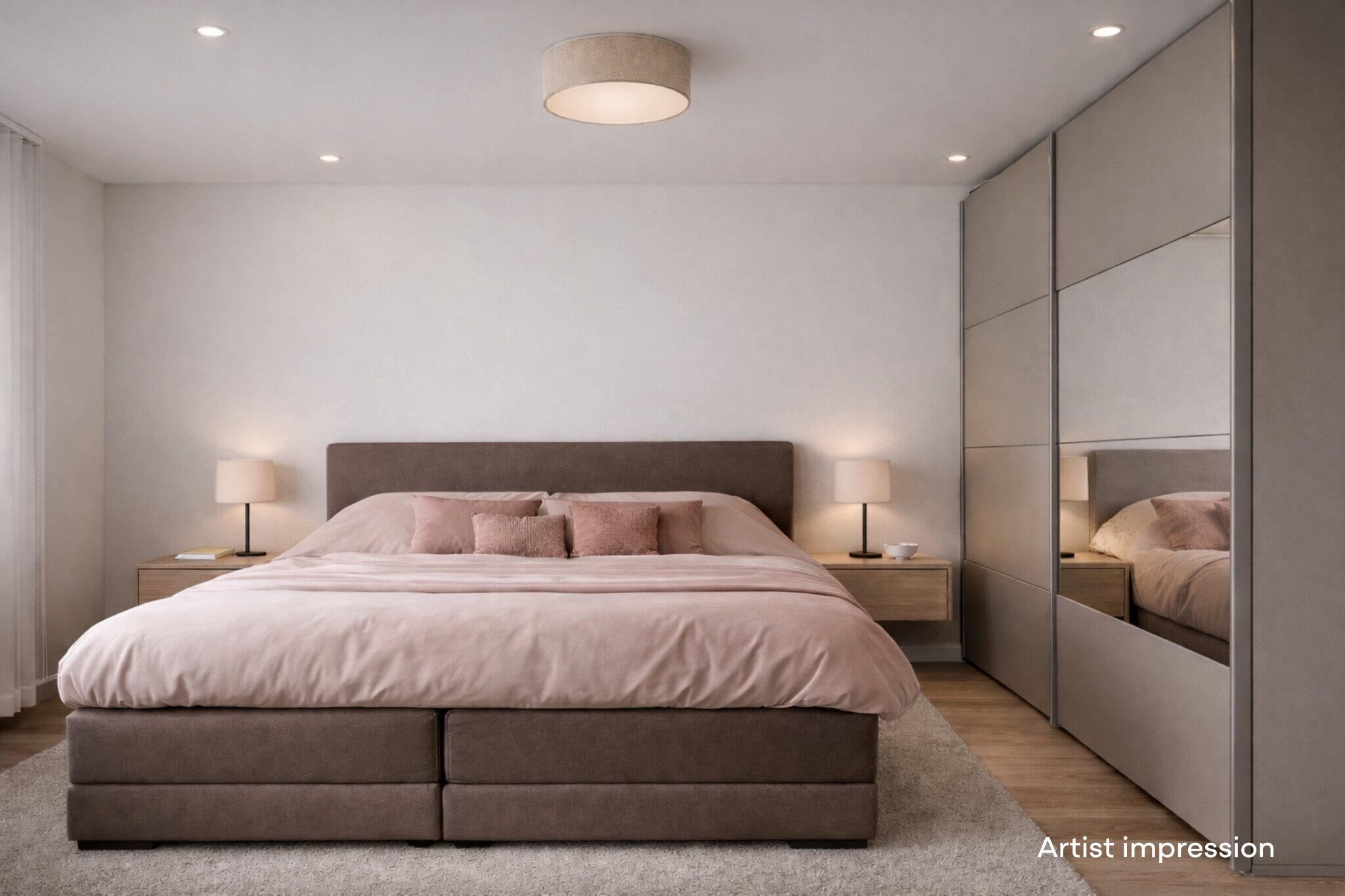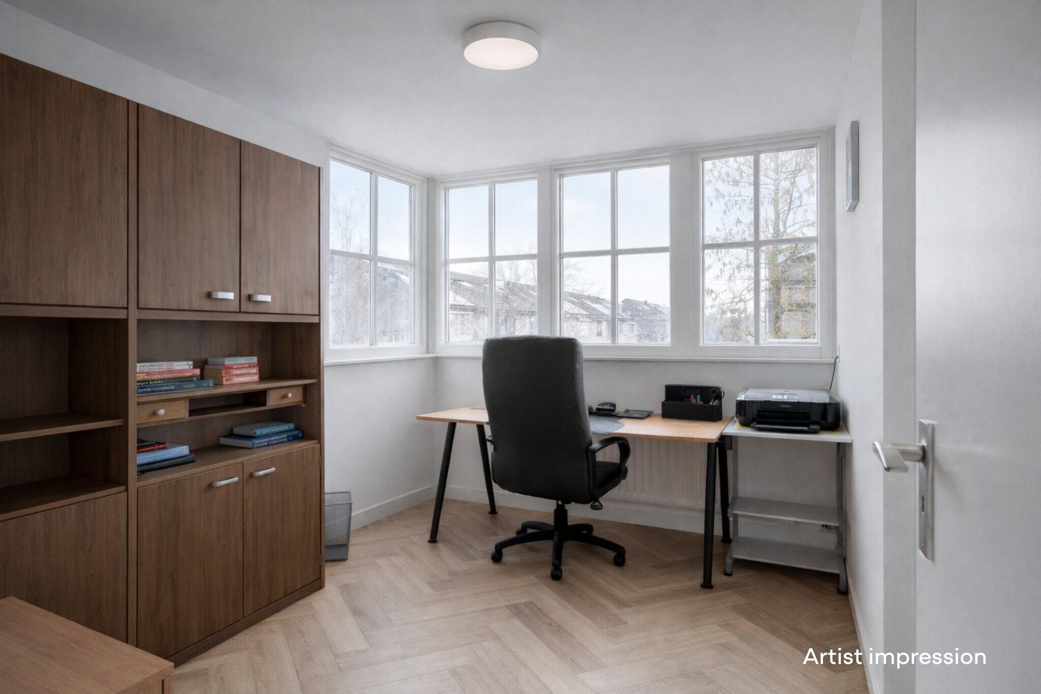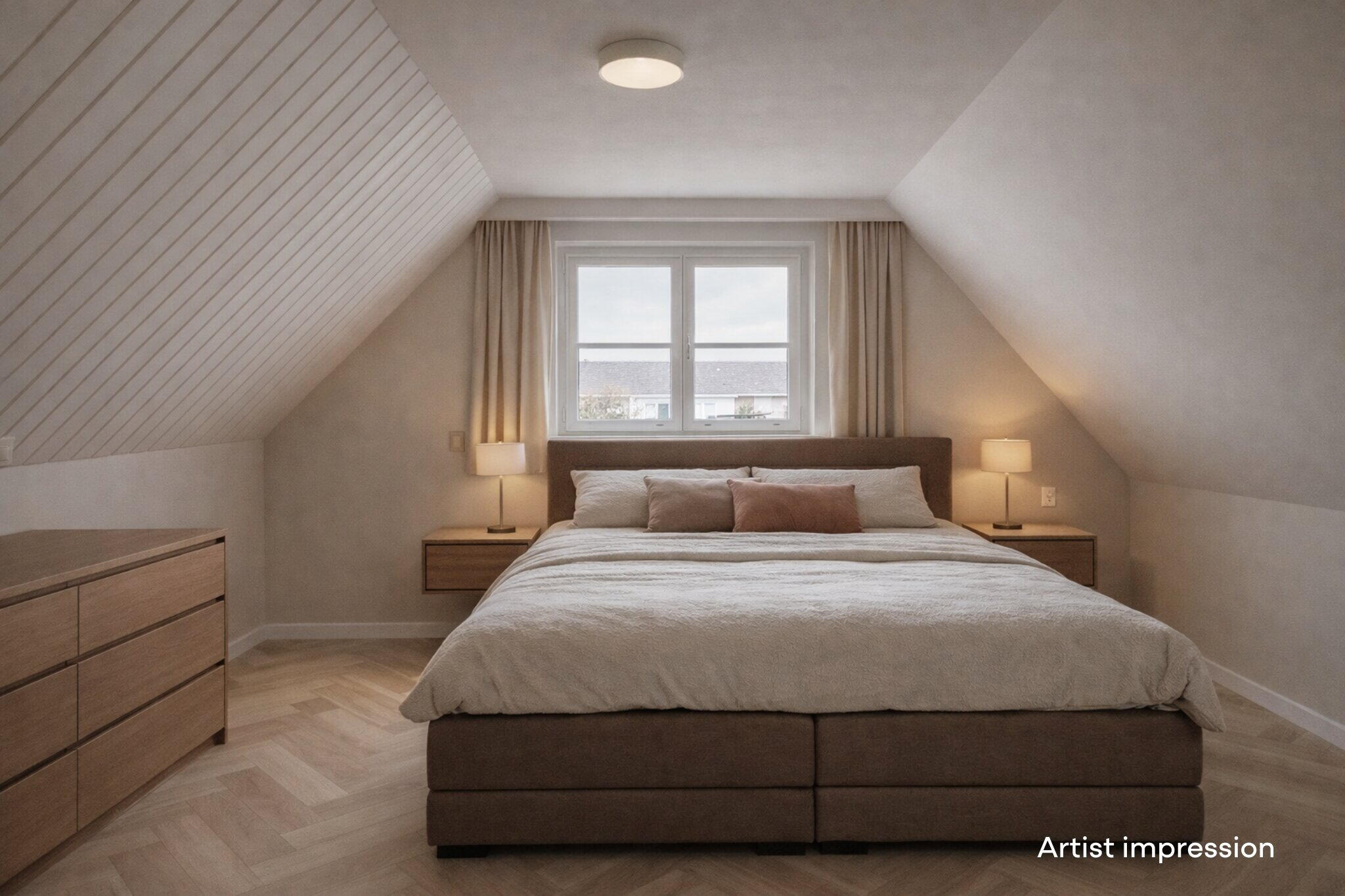 Op de eerste verdieping geeft de overloop toegang tot drie slaapkamers. De grootste slaapkamer aan de achterzijde staat in verbinding met een vierde kamer, perfect als walk-in closet, babykamer of thuiskantoor. Vanuit beide kamers heb je toegang tot het balkon.