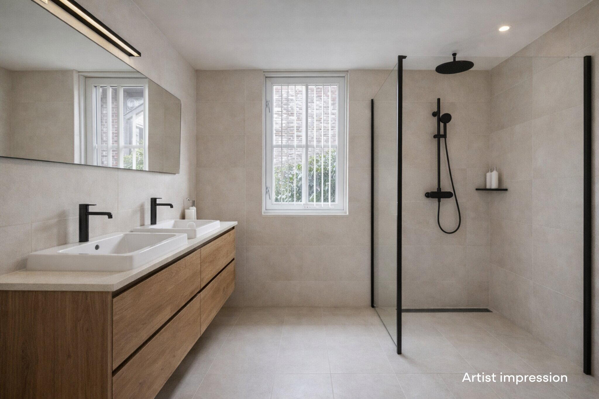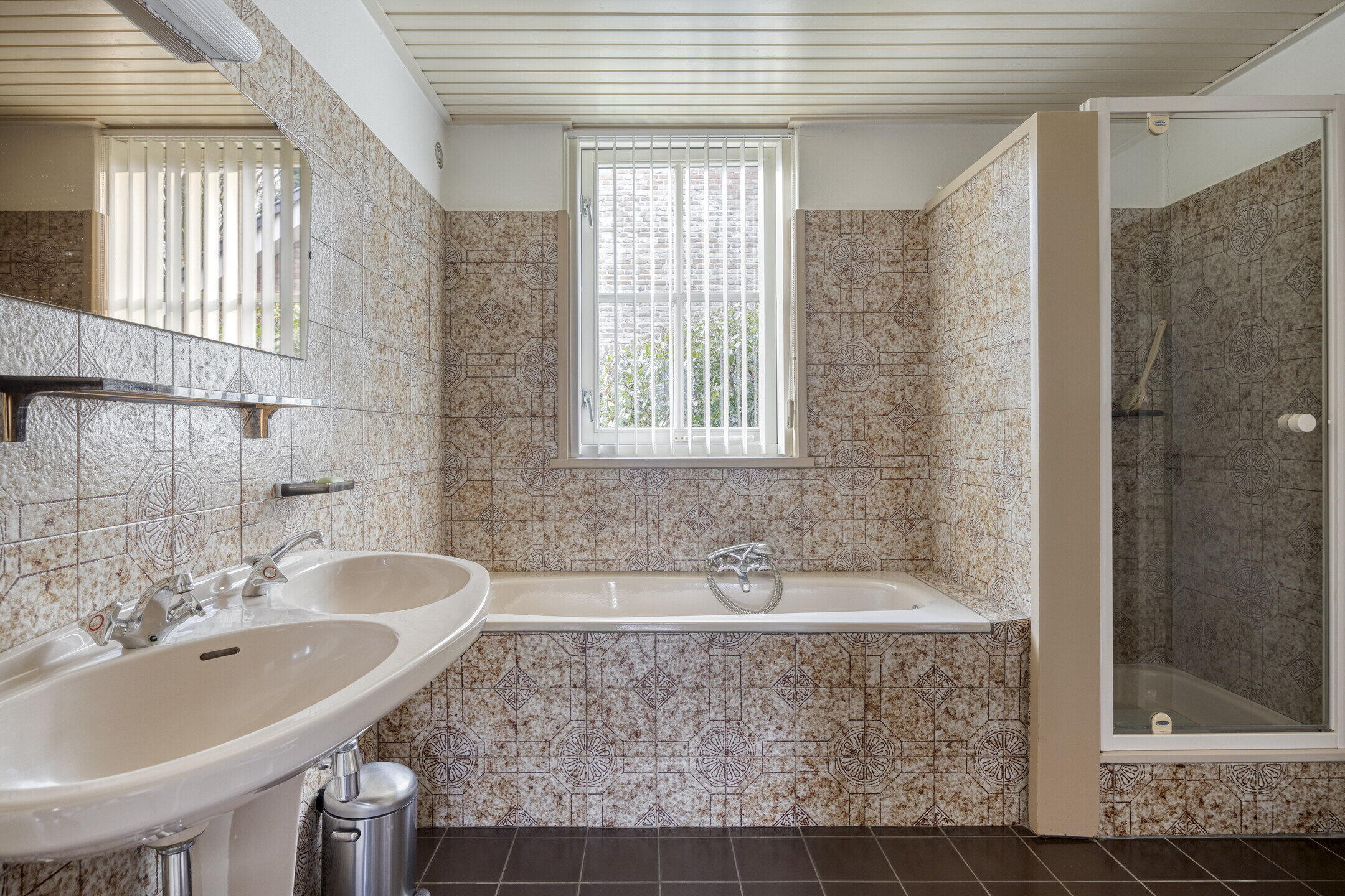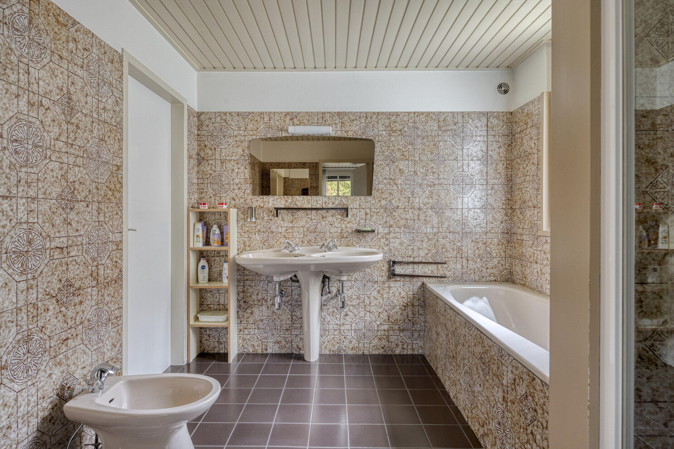 De badkamer is ruim opgezet en beschikt over een dubbele wastafel, ligbad, douchecabine en een toilet met bidet. Hoewel wat gedateerd, biedt deze ruimte volop potentie om hier een moderne wellnessbadkamer van te maken.